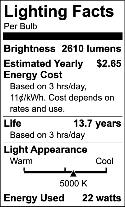 - 150 Watt replacement using only 22 Watts (2610 lumens)